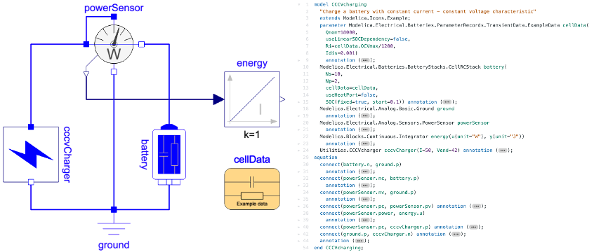 Oh, and by the way, this model models the charging of a battery with a constant current constant voltage charger. (Yes, I know… “model models” 🙄 but I could not come up with a better sentence right now.) And this model belongs to the Modelica Standard Library (you’ll know very soon how to find it when I write: Modelica.Electrical.Batteries.Examples.CCCVcharging). Note that several components appear on the screen (e.g. a ground, a battery and a charger) and are connected together via connection lines. In a few weeks from now, you’ll be able to “read” that from the text too - actually you could already even if I have not explained it yet. And we will also see what each connection line means. It is going to be fun, you’ll see!