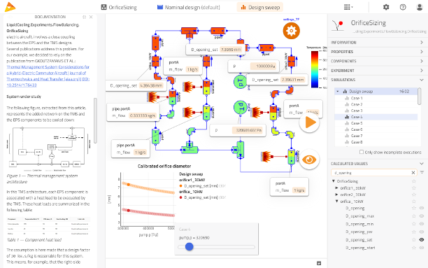 I love this Flow balancing example, not only because I did it 😅, but because it illustrates very well the capabilities of the acausality of Modelica language: you can use simulation to size parts of your system! In this case the orifices in each branch of the circuit are computed to achieve the right cooling. (Sorry for the crowded image!)