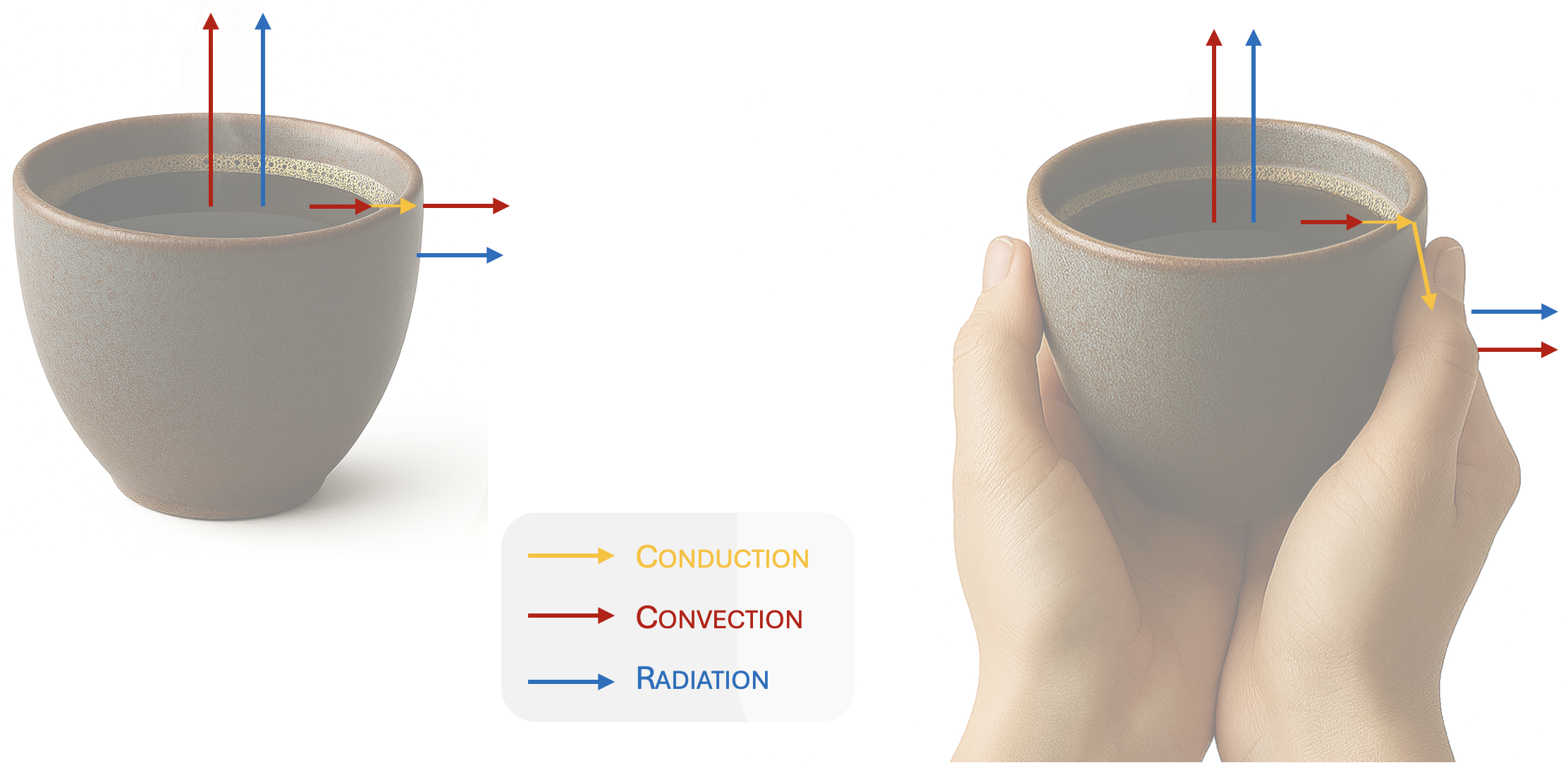 How does the system interact with the environment? It depends what is the environment 🙂 Is the mug on the table? Are your hands around your mug? Does your mug have a cover? These could be different interfaces which involve different heat transfers. Consider the two first cases, as illustrated below. In the first case, both the mug and the beverage can have convection in and radiation through the air (environment). In the second case, the mug is supposed to be totally covered by the hands and thus we get conduction between the mug and the hands as heat transfer.