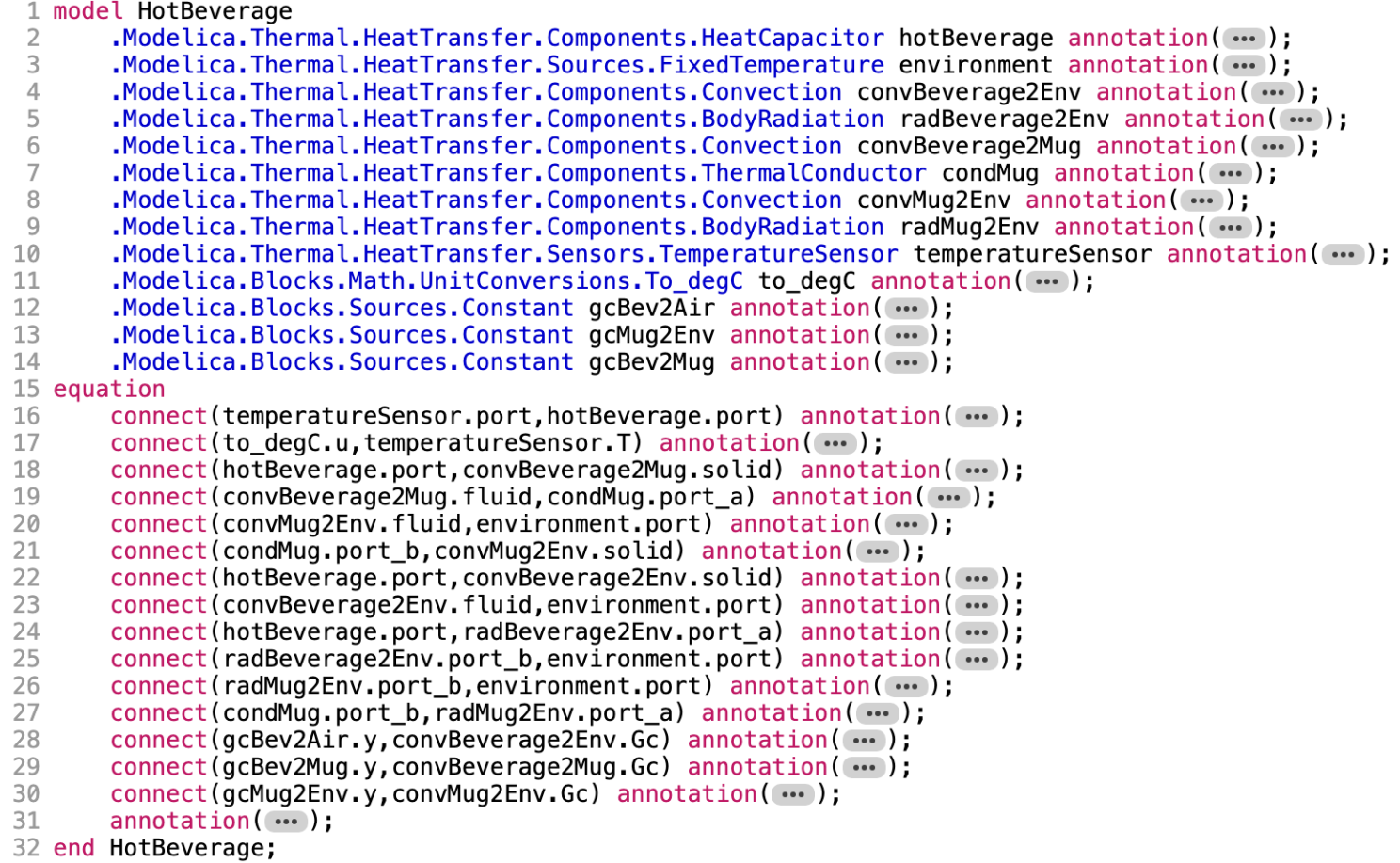 Do you remember that last time we discussed that there is a duality between the graphical view and the Modelica code? Well here you can see the exactly same model in code: