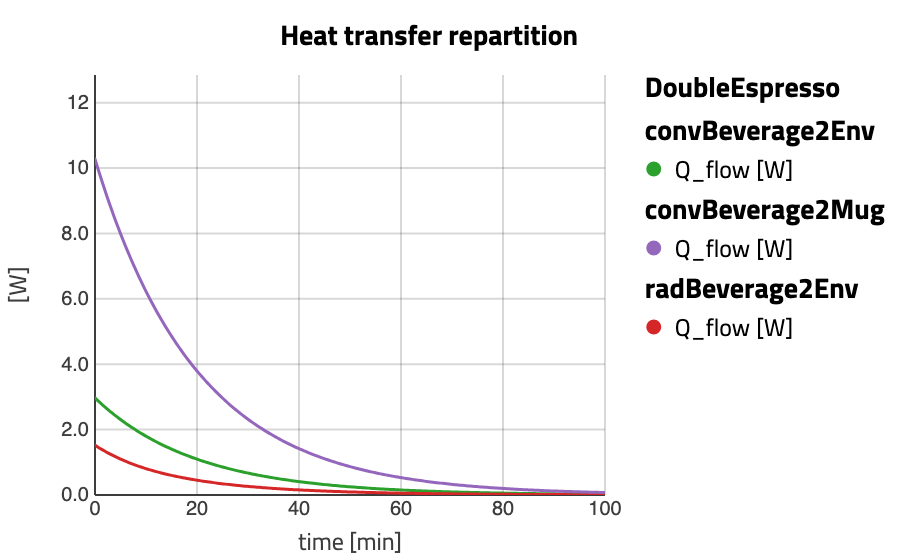 Interestingly, the heat transfer repartition shows that more than two thirds of the heat is evacuated via the mug and only less than a third via the espresso surface in contact with the air.