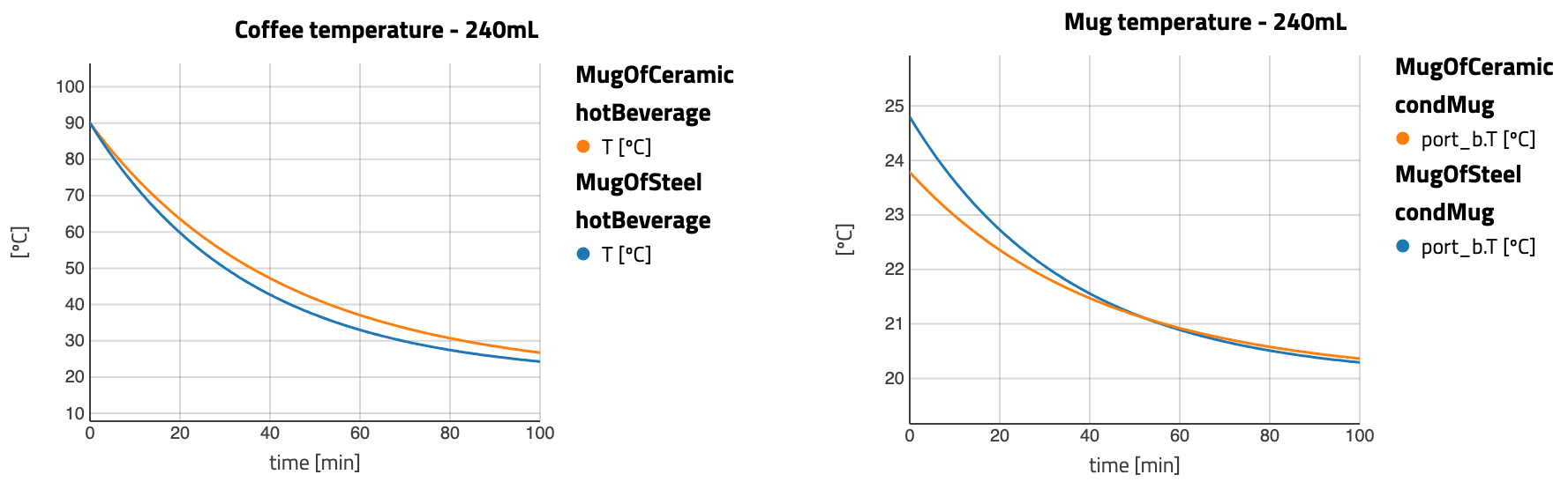 They do… but not that much. And why? Because the amount of hot beverage is so low that there is not that much of an effect (though still visible). So what if we had a larger drink? The heat capacity would be higher and we could expect it to take longer to cool down. Let’s see!