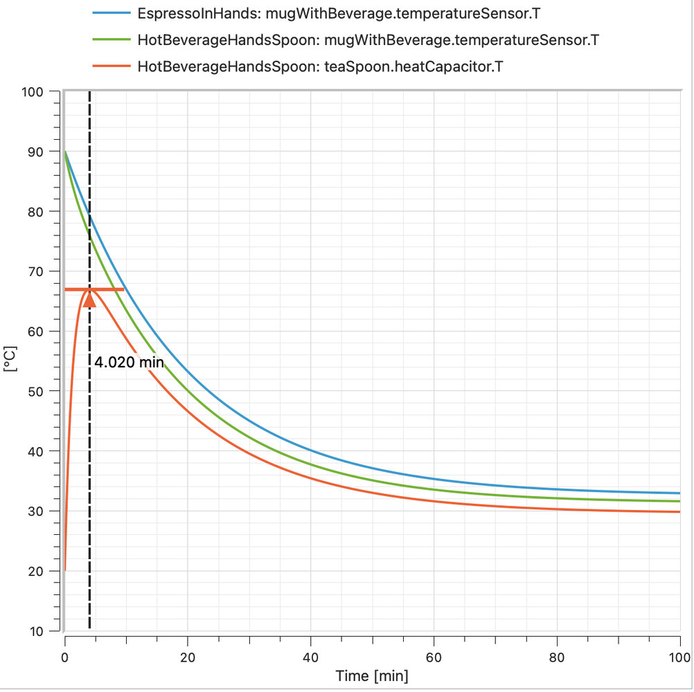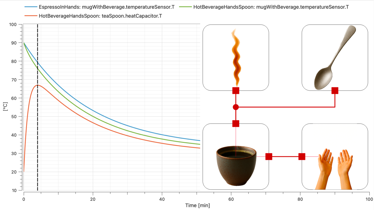 It’s an opportunity because it allows for: - A cleaner model and understanding of what each model assembly does. Currently the coffee mug is still a simple model; imagine how a complex system could look like in this “flat” approach (read “all in one layer”). - A better reuse of each subsystem in a future model (or actually in the same model - imagine we need two cups). - Defining template where we can easily exchange matching models (e.g. switching between having hands around the mug or none, directly in contact with the air). - It is much easier to exchange model across tools this way. (Hey Christian Bertsch, don’t tell anyone but I am preparing the ground to talk about FMI in the next article!)