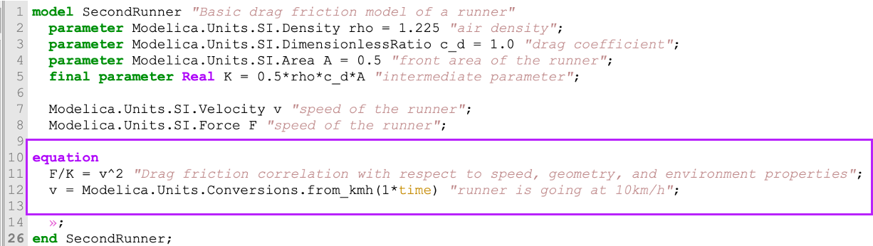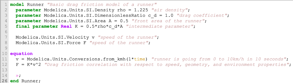 We see that the Modelica code is quite readable: - The model starts with model ModelName (here the ModelName is Runner) and ends with end ModelName; - Then we have different types of variables: 1. The variables which value will not change during the time simulation are called parameters and are identified by a keyword parameter. Here I need to stop for a second and expand on this. Modelica makes a difference between constant and parameter. A constant has the value specified once before compilation and the value cannot change. The parameter can get its value changed until the simulation starts. (This last sentence is still partly incorrect as there are differences between structural and non-structural parameters, but let’s keep that for later.) 2. The variables which value can change during the simulation. These are time variable and do not have such a keyword that precedes them. - Here we specified the “type” of the parameters and variables with their units, that are available in the Modelica Standard Library (we often refer to it as MSL). But behind, these are all Real with specific units. - Note that we could define a final parameter, which basically freezes how the parameter is computed from the others. You cannot overwrite its definition later on when using this model. - Finally, we have an equation section where we write the time relationships of our variables - (And the small a on line 14 hides a lot of graphical and dependency annotations that I could have removed but I wanted to keep them so you know they exist. No need to dig into these now)
