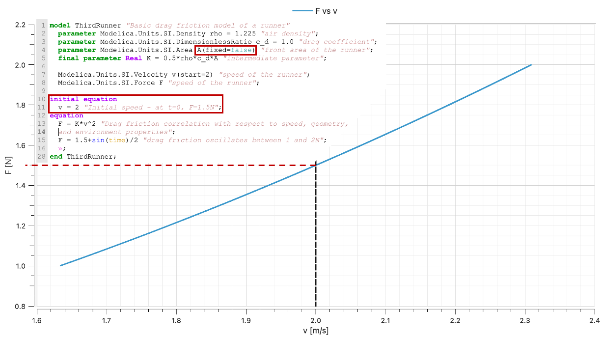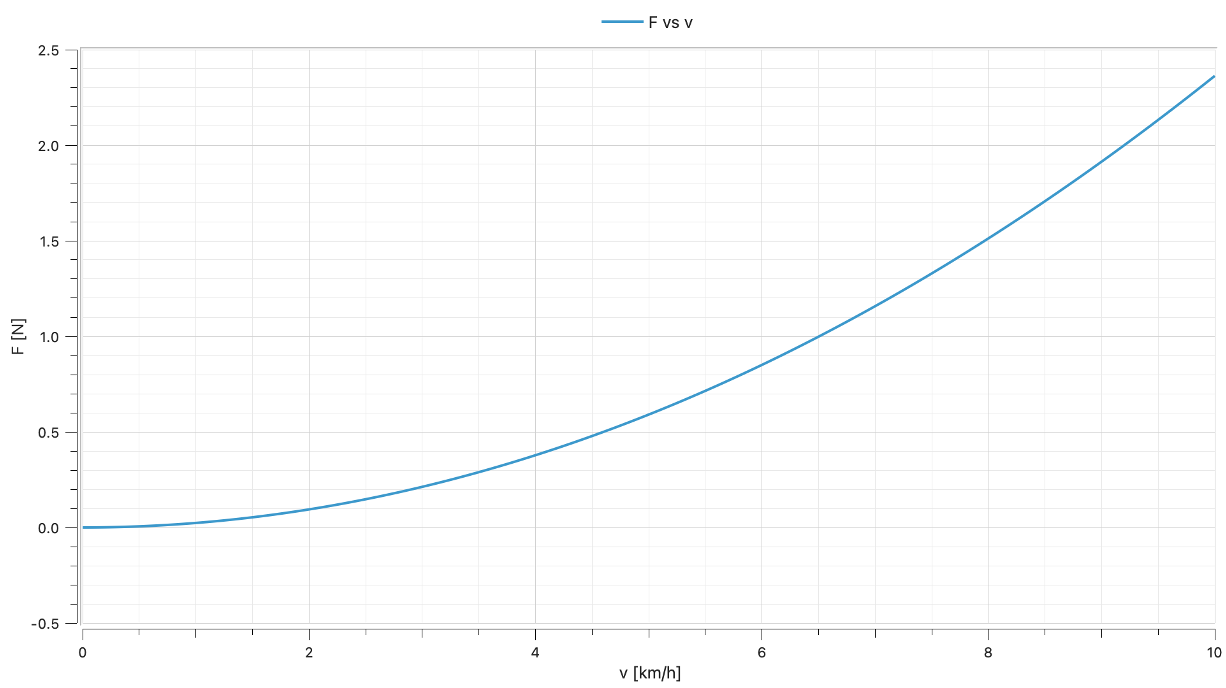 You might actually just “feel” how much effort you want to put. And let’s assume that the force you put in fighting the aerodynamic drag oscillates between 1N and 2N. Then the Modelica model changes slightly: only the equation section, the speed is no more specified and the force is.