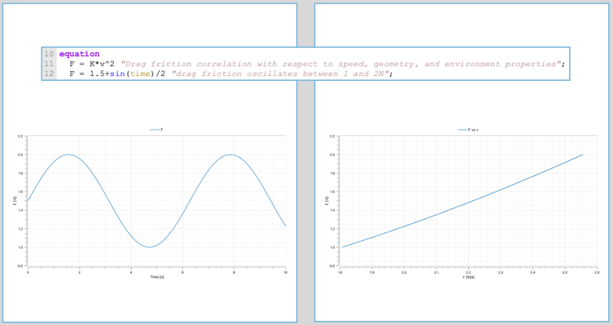 But it is not stopping here with Modelica! You can additionally find out parameter values if you specify the values of all variables (at initial time). So for the equation F = K*v^2, if F and v are known at initial time, the compiler will find out that value of K, and if all the parameters composing K are known but one (let’s say the area A), then this one will be found out! 🤯