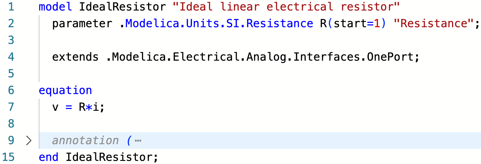 We have not seen much of the Modelica language so far. So let me paraphrase the code: - this IdealResistor has the same interfaces than a OnePort model. The one port model has two electrical pins and defines the voltage difference between the two pins as V and the current entering the component from the blue pin as positive. - I declared a parameter R of type Resistance so that it also gets the unit [Ohm] and assigned a start value of 1 Ohm. Why a start value? You’ll soon see. For now, it is enough to say that: 1. if you give the parameter a value, then this start value is not used, and 2. 2. if you don’t provide a value while it is needed, then most compiler will use the start value as parameter value (and raise a warning). - The very famous Ohm’s law is simply written as equation: V=R*i.