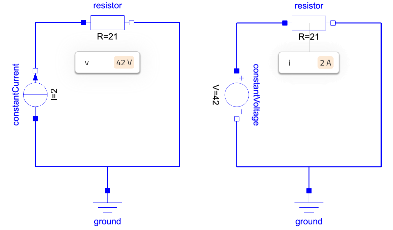 We set up two examples, both with a resistance value of 21 Ohm. This is a silly value but I don’t mind, I know the universal answer is 42, and this model gets to it… Where was I, ah yes: two examples. - On the left side, we specify that the current that enters the resistor is 2A. Ohm’s law tells us that the voltage V should be equal to R*i=21*2=42V! The universal answer! And that is what our simulation says! - On the right side, we specify that the voltage is 42. We want to prove that the model will be turned around and give us the same current i as on the left side: i=V/R=42/21=2A. Done!
