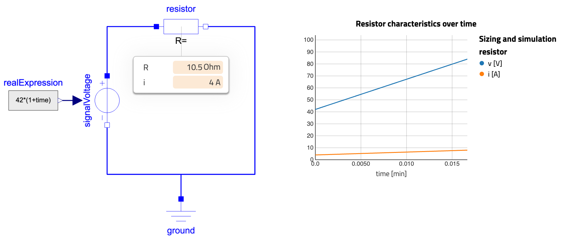 Remember how last week we could use our same equation to calculate the parameter value (the area of the runner)? Here we can also use the model to define the value of the ideal resistor. We just need to take one of the two examples and specify the value of the missing variable at initial time. So let’s take the right example and say that the initial current is 4A. We call that bicausality - because both causality are specified - or sizing - because we size the resistor’s resistance - or on-design simulation - because we solve a design problem. (Just in case you face these words in the future.)