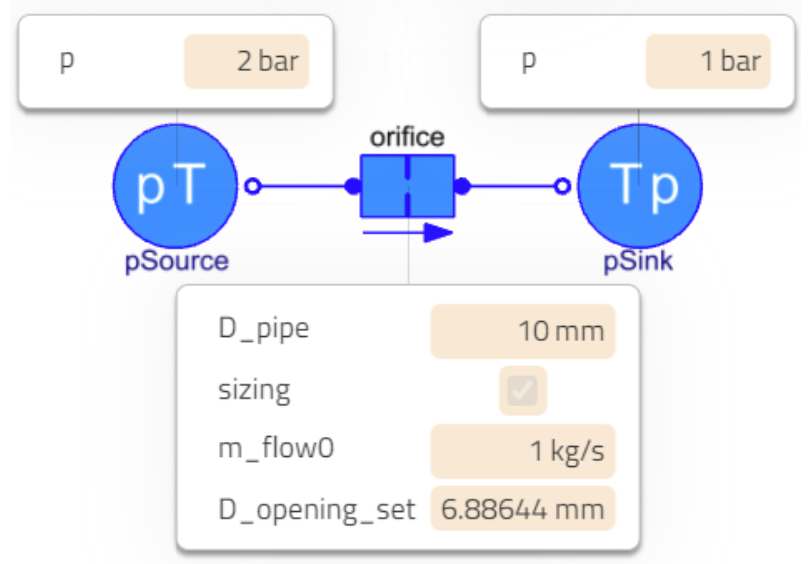 In the case of the orifice, we expect the pressures to be known at both sides and thus we additionally allow for specifying the initial mass flow rate in sizing mode.