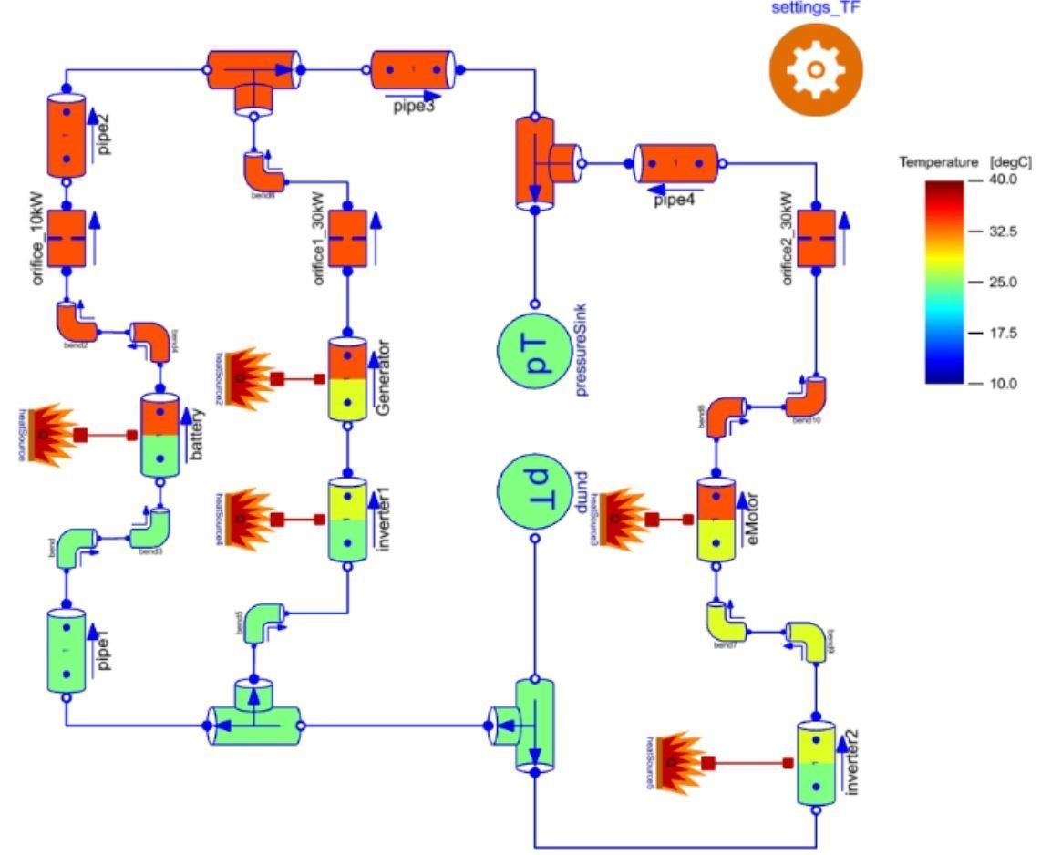 On the overall system (below), we have three of such orifices (on the upper part of each branch) and they are meant to be sized to evacuate the right amount of heat coming from the “fire / exploding / red crown” components that represent heat sources.