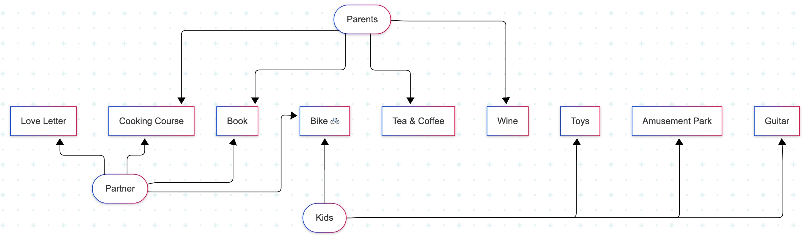 We see that some gifts could be for different persons. You might really like this book and want to give it to both your partner and your parents. Or both your partner and kids need a new bike!