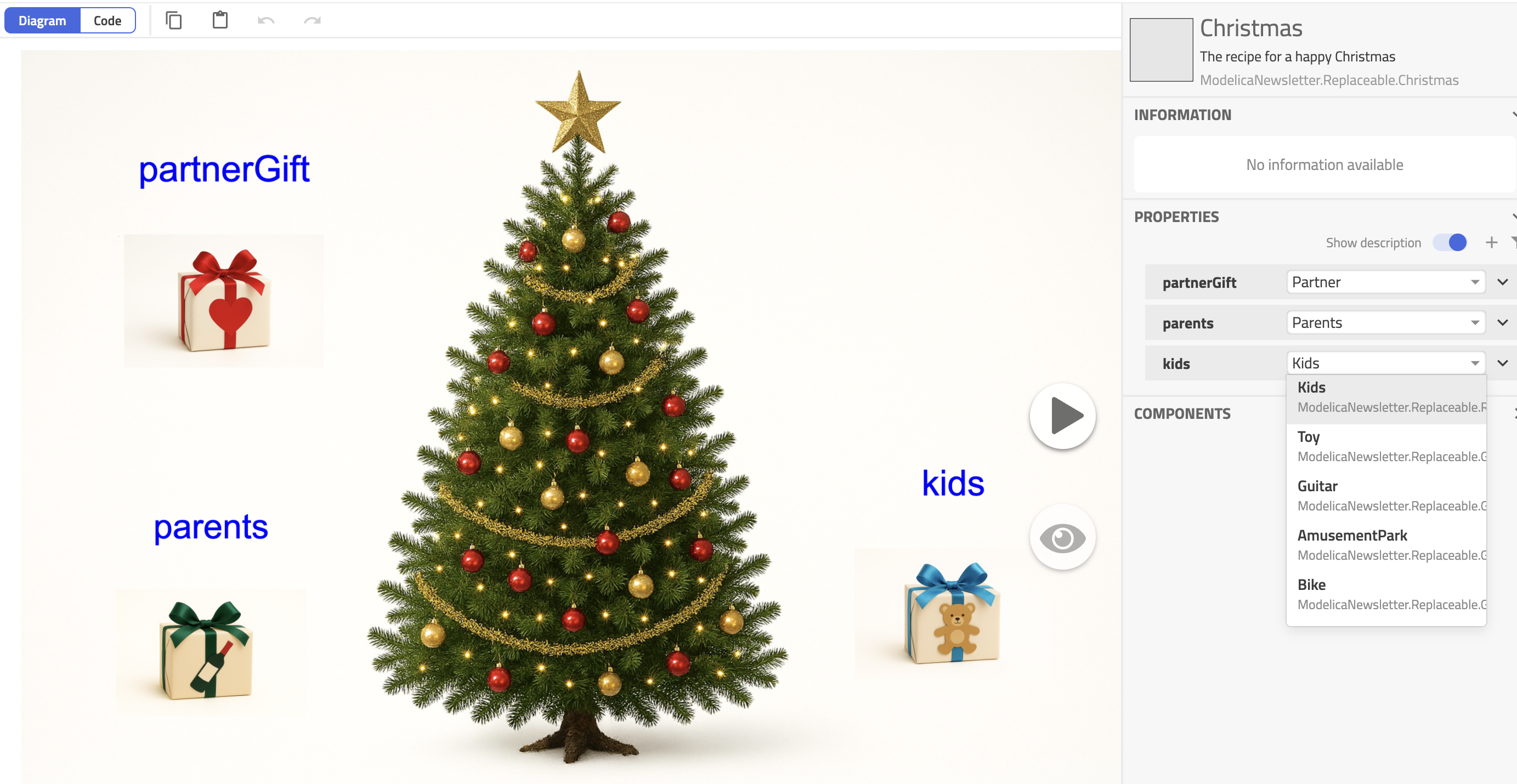 replaceable .ModelicaNewsletter.Replaceable.Receivers.Kids kids "Your kids can choose their gift from the list" ;