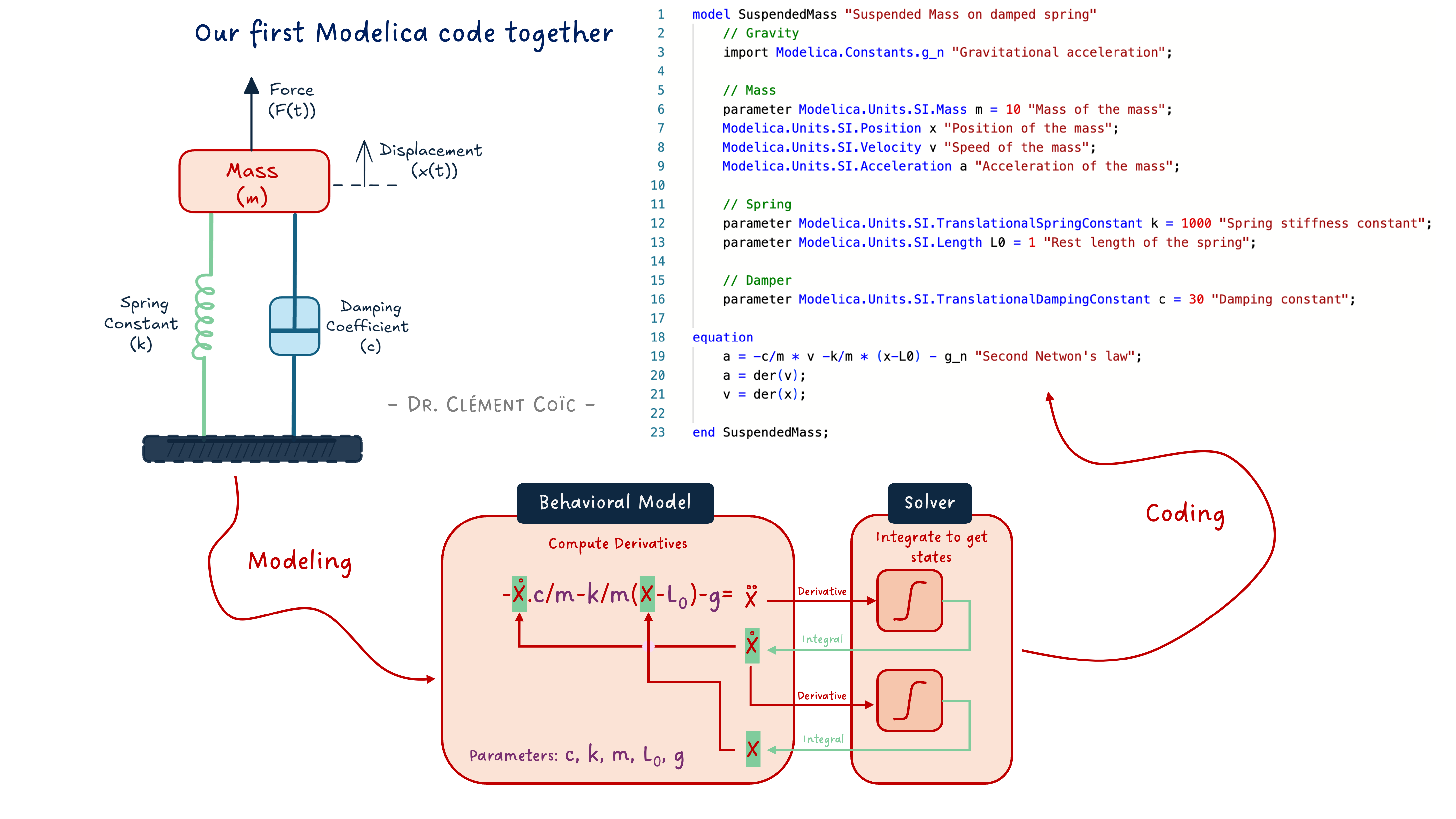 Note: I am a big fan of doing something easy first. Doing something that you know, in a different way. The value is that you don’t need to put effort into understanding several things at once. You know the topic, then you just have to focus on the implementation. So we’ll code the famous suspended mass example, that was also discussed in the last article about FMI - get back to it quickly if needed. I mean, this is typically a model that should be done by composition (drag&drop) - all component models are available in the MSL. It is really just for the purpose of explaining code that we will use it here.